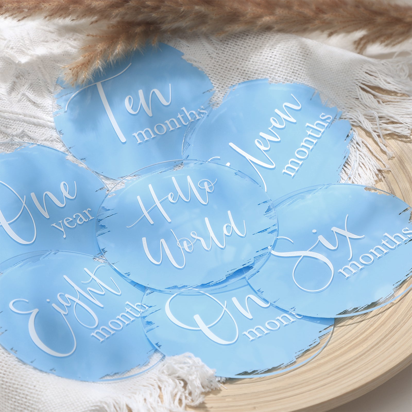 UNIQOOO 13Pcs Blue Baby Monthly Milestone Marker Discs Handmade-Style Printed|Acrylic Milestone Cards for Baby Announcement