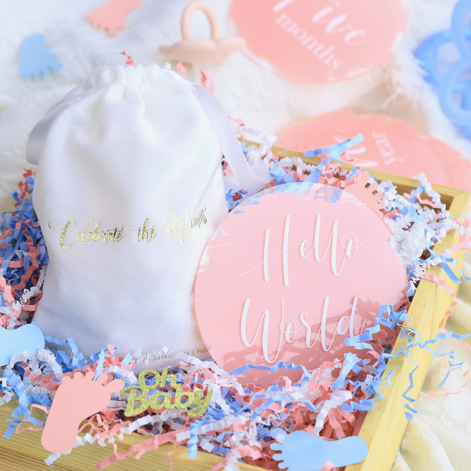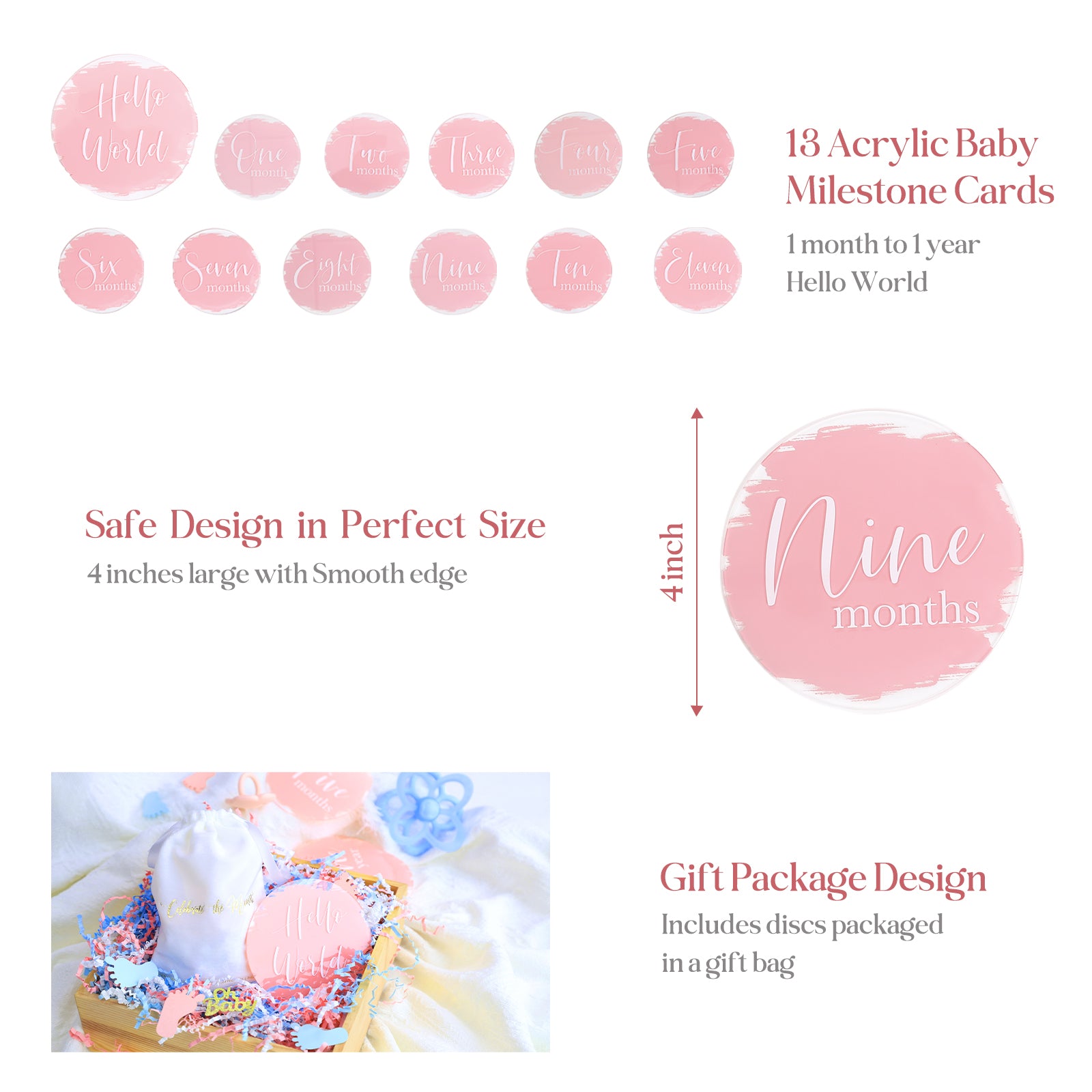 UNIQOOO 13Pcs Pink Baby Monthly Milestone Marker Discs Handmade-Style Printed|Acrylic Milestone Cards for Baby Announcement