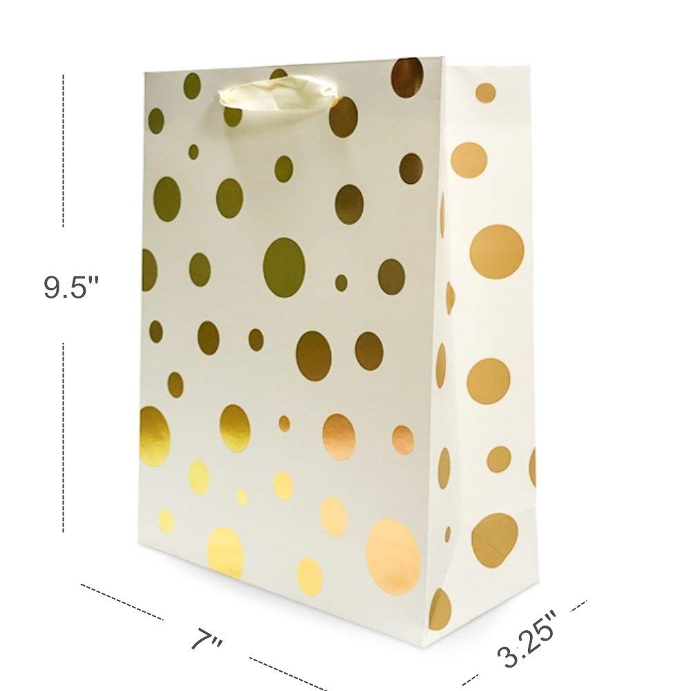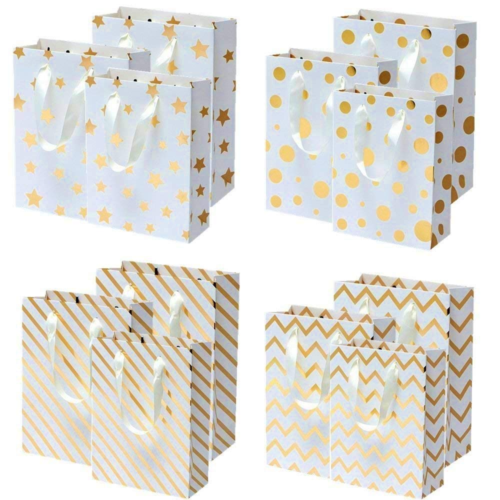 UNIQOOO 12Pcs Premium Gold Metallic Stars Medium Gift Bags Bulk, 9 1/2"x 7X 3 1/4" 100% Recyclable Paper Retail Shopping Bags, Ribbon Handle/Wedding,Baby Shower, Birthday Party,Christmas Gift Bags ( Only Delivery to US)