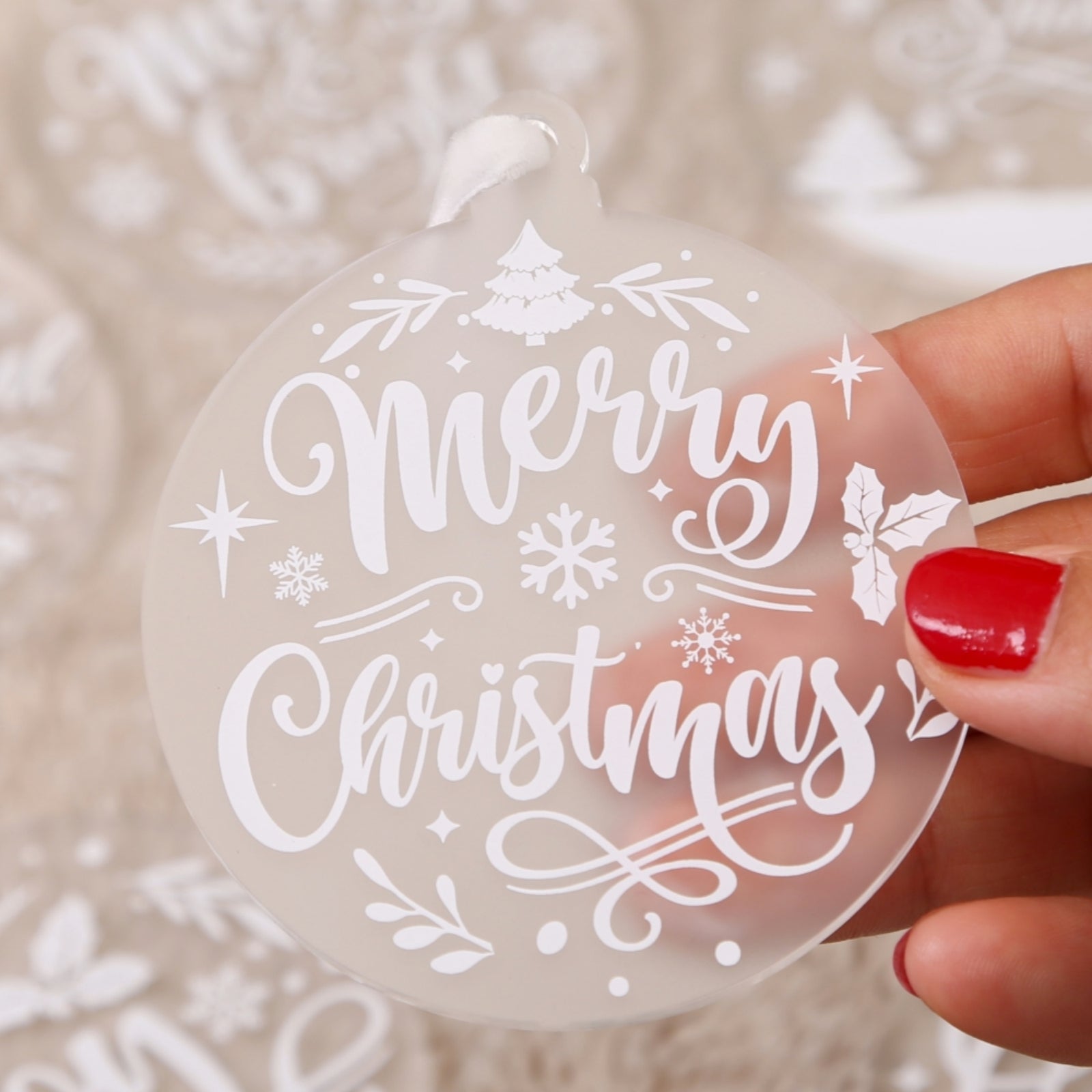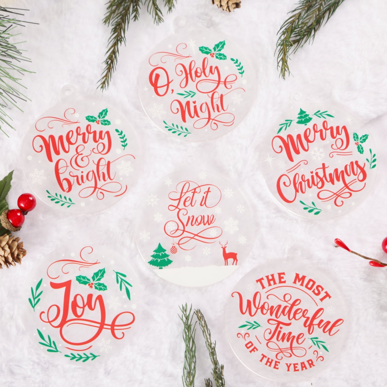 Acrylic Ornaments Set of 12, Frosted Christmas Ornaments, 6 Holiday Designs, Xmas Tree Decor, Frosted Hanging Tags